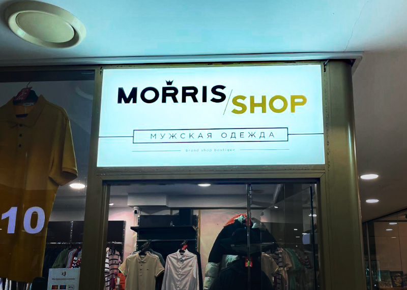 Новая вывеска для магазина мужской одежды Morris Shop была изготовлена на производстве компании Граффо и установлена в ТЦ Екатеринбурга.